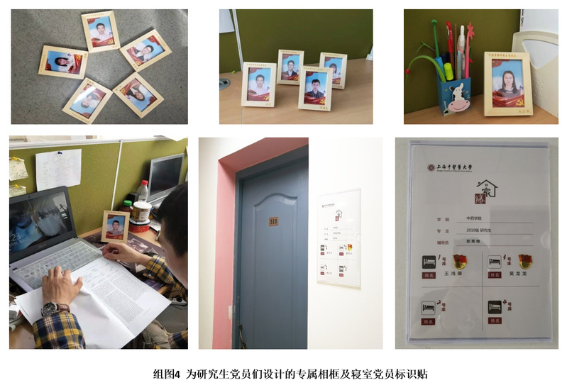 除此之外,我们也根据校党委关于“不忘初心、牢记使命”主题教育工作的第二十一条工作提示,着力推进“五进三亮”工作。我们为研究生党员们精心设计了专属的相框置于实验台,以展示党员身份和党员精气神,同时我们还在宿舍名牌上张贴党员标识,将佩戴党徽与在生活和学习场所亮身份相结合,在实验室和寝室这两个最公开、活跃最频繁的地方亮明身份,以此彰显党员魅力,展现党员实力,提升担当意识和奉献意识,时刻告诫自己是一名光荣的中共党员,要用实际行动在自己的活动领域里发光发热,争做楷模,接受群众监督。