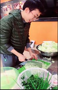 接着导师团的老师们纷纷过来了,陈老师开始教我们怎么调馅和馅,放盐放姜葱蒜的讲究……男生女生围坐一团,等老师调料放好了,有力量的几个男生便卷子了袖子开始和馅了。看着那种生动的大家一起劳动的场景,还有老师们亲自指导我们的情景好不开心。