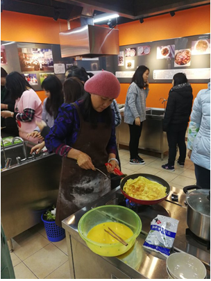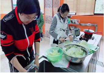 正式开始活动的时间还未到,杂物间大桌子上满满当当地堆满了外套和书包,整栋楼里都是实训室传出的哐哐铛铛切菜的声音。好家伙,大家把袖子都挽了起来,干劲十足,水在锅里咕噜咕噜地冒着泡,菜在水槽里哗哗地冲着水,一人两把刀,手起刀落,刀工了得的小姑娘运筹帷幄,胸有成竹,小伙子们闹哄哄地一通乱剁,也是有模有样,好一派热火朝天的景象。