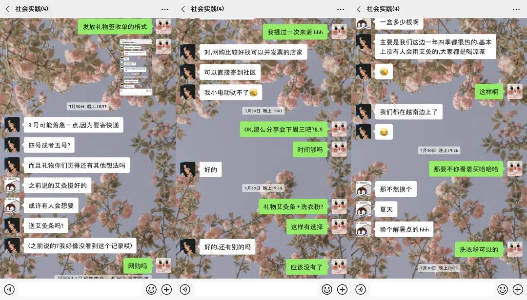 组员们了解当地习俗后,确定了分享会的内容,决定以居民们都感兴趣的凉茶文化为主题,举办一个有趣且贴近生活的分享会。同时,准备了洗衣粉、洗洁精等生活用品作为礼物。分享会筹备前期,组员与广西壮族自治区钦州市钦南区文峰街道三宣堂社区工作人员沟通,讨论了合办分享会的事宜及物资采购。确认合作之后,组员开始商定分享会细节及PPT的制作。