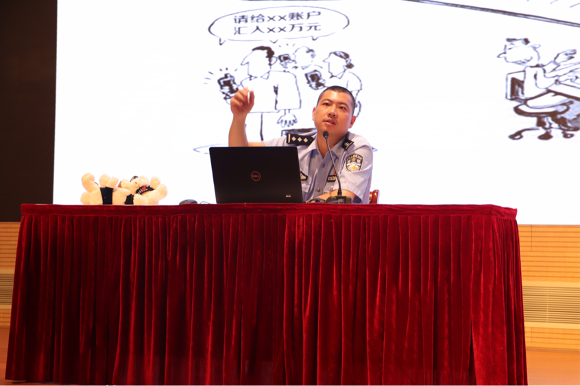 随后,刘宁警官通过一次互动开始了本次安全教育。本次讲座中,刘警官介绍了十大常见的校园诈骗案件类型,包括冒充熟人诈骗、“刷单返利”、“网贷平台”“消除”不良个人征信记录诈骗、游戏道具交易被骗、网上购物类诈骗、网上购票诈骗、网络交友投资理财诈骗、虚假信息或虚构事故诈骗、网上贷款激活验证诈骗甚至冒充公检法等等的案件类型。介绍案件类型的同时,刘警官针对每一类案件进行了细致分析,并特别介绍和强调针对不同案件类型的防骗策略。