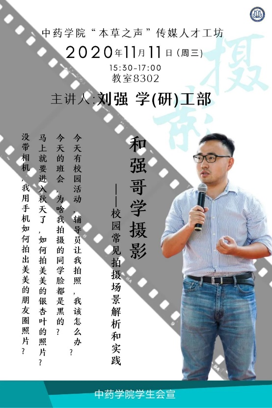 摄影是一项不可缺少的技能,不论是记录活动中的难忘瞬间,还是留存下身边美丽的风景,都需要我们掌握一定的摄影技巧。收米直播 “本草之声”传媒人才工坊第二期聚焦摄影学习,学(研)工部刘强老师将带领大家进行校园常见拍摄场景解析和实践。