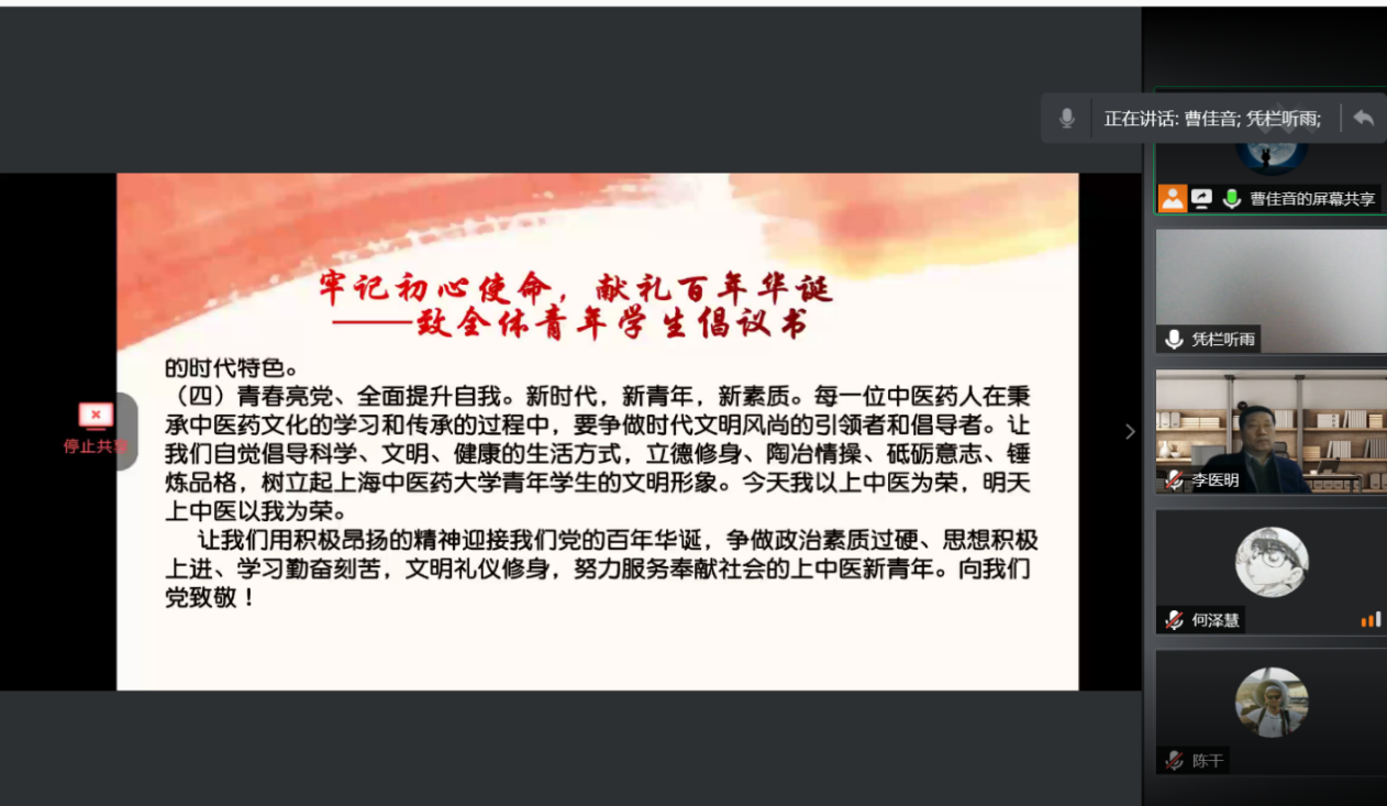2021年2月20日,党史学习教育动员大会在北京召开,习近平总书记强调,在全党开展党史学习教育,全党同志要做到学史明理、学史增信、学史崇德、学史力行,学党史、悟思想、办实事、开新局。为庆祝中国共产党百年华诞,号召中药学子牢记初心使命,倡议全体青年在新时代接续奋斗,以党史学习教育动员大会为遵循,2月24日,收米直播 研究生党总支举行党史学习教育动员大会,收米直播 党委书记李医明老师,党委副书记沈漫老师,研究生党总支书记陈秀兰老师出席,会议由总支组织委员曹佳音主持,研究生党总支全体党员参会。