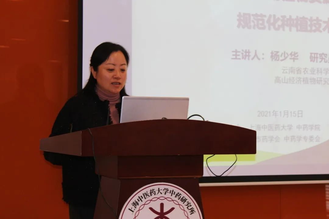 讲座正式开始,杨少华研究员作了题为“云南丽江高山药用植物资源及道地药材规范化种植技术”的报告,围绕云南的地形、气候等自然条件、自然资源普查等方面介绍了丽江的植物资源以及其团队所作的一系列工作,包括丽江市中药资源普查、药材市场走访、标本制作以及重点品种调查等。以云木香为例,介绍了道地药材规范化种植技术的研究,从品种溯源、基地生态环境及种子质量检测、到规范栽培管理过程作了大量细致的基础工作,最终通过了国家GAP认证,并通过开展培训,将云木香的规范化种植科普给种植农户和生产管理人员,真正让科研服务于生产。讲座内容也引起了线上线下师生的极大兴趣,纷纷通过问卷、现场提问的方式与杨少华研究员交流,互动氛围热烈。