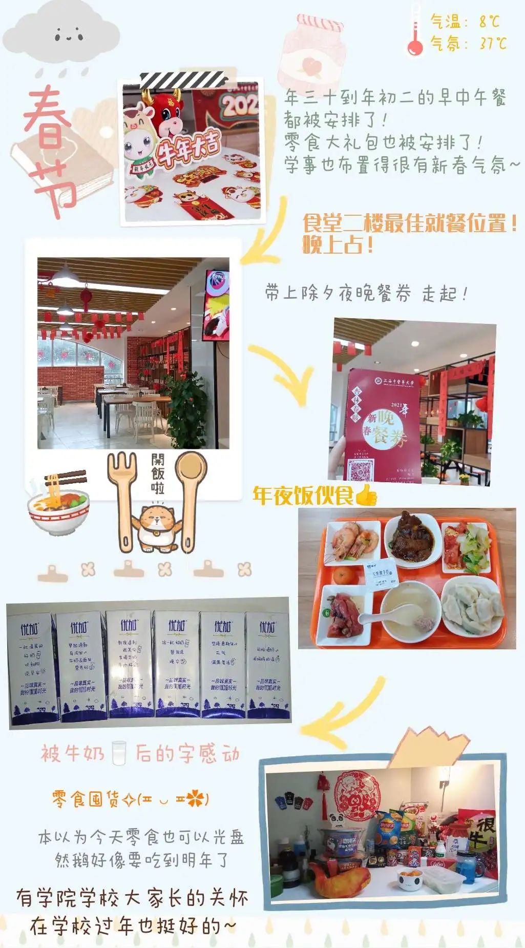 但是这并没有让我感觉到孤单,课题组还有很多跟我一样留沪的师弟师妹,收米直播 学校准备的营养零食大礼包特别丰盛(牛肉粒、鸭翅、牛奶、巧克力、大白兔奶糖、薯片!超多!),年三十到年初二的早中晚餐也被安排上了(说都想吃,食堂叔叔阿姨都说只要你吃得下哈哈哈),收米直播 学校园区的大家长们很关心留校的我们,吃喝是不愁的~而我也是我们宿舍楼栋留沪过年的小盆友们的大家长,给她们发餐券代领大礼包,做一些力所能及的事情~