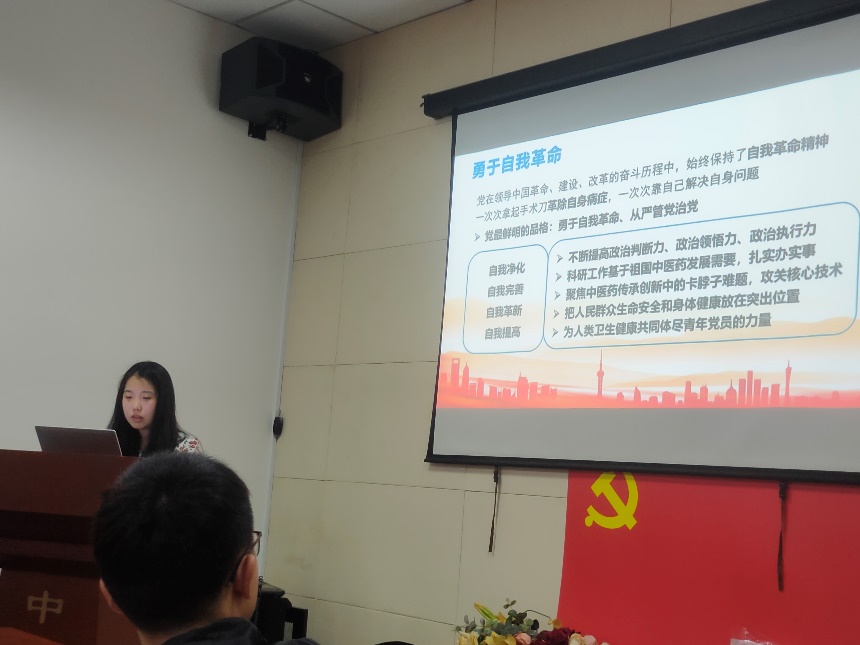 会议开始,支部书记曹佳音就“全面从严治党的必要性”展开叙述,党情的需要、国情的要求和世情变化,迫切要求中国共产党必须贯彻好党要管党、从严治党的方针,不断提高党的领导水平、执政水平以及应对外部环境考验的能力。接着,支部书记曹家音以时间轴的形式向我们展示了“全面从严治党的历史严格”,用丰富的史实回顾了中国共产党百年奋斗的光辉历程和历史性贡献。