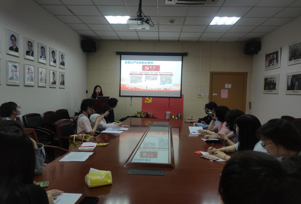 会议开始,支部书记曹佳音就“全面从严治党的必要性”展开叙述,党情的需要、国情的要求和世情变化,迫切要求中国共产党必须贯彻好党要管党、从严治党的方针,不断提高党的领导水平、执政水平以及应对外部环境考验的能力。接着,支部书记曹家音以时间轴的形式向我们展示了“全面从严治党的历史严格”,用丰富的史实回顾了中国共产党百年奋斗的光辉历程和历史性贡献。