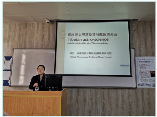 讲座正式开始,银巴老师以“藏族天文历算与藏医药学的关系”为题,给大家介绍了藏族传统天文历算学、藏历历书、藏医与天文历算之间的历史渊源关系、历算和藏医的各种学派、理论基础,让大家对藏医文化有了感性的认识,天文历算与藏医有着共同的理论基础,因而能够指导药物种植、采收,乃至疾病的诊断治疗。