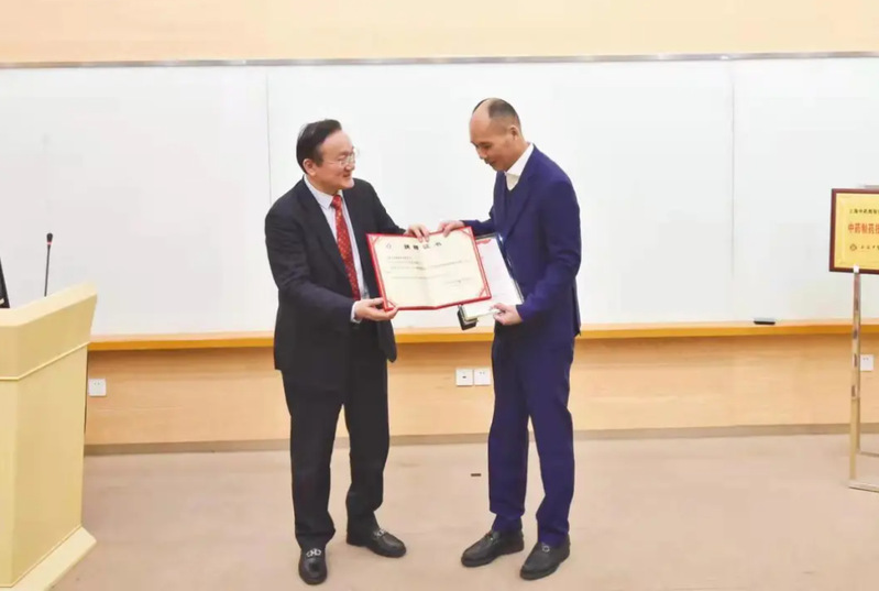 徐建光向国家级非遗项目中药炮制技艺(人参炮制技艺)传承人、福参源保健品有限责任公司董事长王俊良颁发客座教授聘书,并为其佩戴校徽。王俊良向上海中医药大学捐赠2支野山参珍品作为上海中医药博物馆藏品陈列展示。