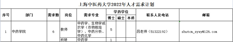 上海中医药大学2022年人才需求计划