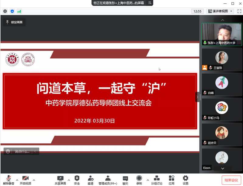 厚德弘药导师团以“立德树人”为根本任务,以培育和践行社会主义核心价值观为目标,坚持“为了每一个学生的终身发展”的理念,建构“全员育人、全程育人”的工作体系,努力实现研究生教育、管理和服务工作协同创新发展。同时围绕收米直播 “争创国际一流收米直播 ”的办学理念,为培养适应中药现代化、国际化的教育、研究、医药服务与管理等多方面综合素质人才而奋斗。一直以来厚德弘药导师团密切关心同学们的学习以及生活状态,此次线上会议正是由厚德弘药导师团团长、收米直播 院长张彤老师主持,市卫健委副处长聂爱国、上海市药材公司总经理张聪等导师团所有成员参与。交流会上导师团的老师们对同们积极参加抗疫志愿活动以及认真学习的学习态度表达了赞赏和肯定。