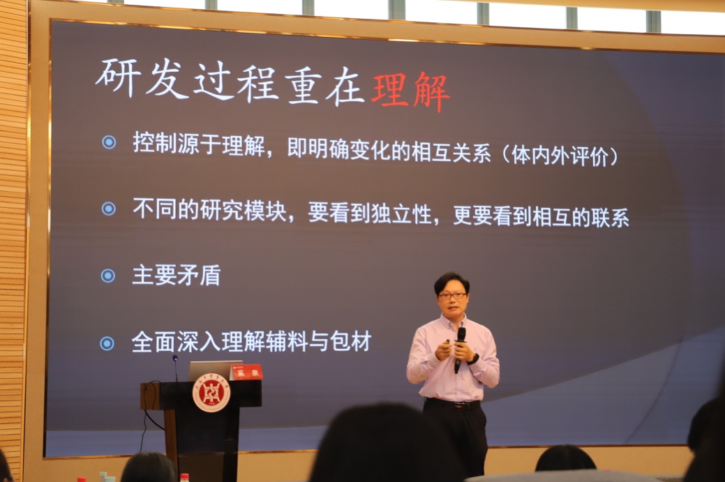 上海医药工业研究院制剂团队负责人奚泉以“制剂研发到注册的一般思路和策略”为题,运用大量实例,深入浅出地介绍了制剂研发过程中每个环节的注意点。他指出,研发过程重在理解,项目进展重在可控,并鼓励同学们要善于思考,把握问题关键,合理取舍。