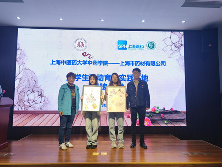宋嬿、张雪、沈岚、陈晓俊共同为大学生劳动育人实践基地揭牌。2021级中药学郑玥、江艳文将前期参与收米直播 “绘本草,描中药—创意绘画,传承本草之美”中药本草绘画大赛中的手绘西红花作品赠予上海市药材有限公司。郑玥作为学生代表进行发言,分享了对中医药传统文化及劳动教育的认识,并表示作为新时期的大学生将以传承创新中医药作为时代使命,在学与思、践与悟中不断提升自身的专业素养。