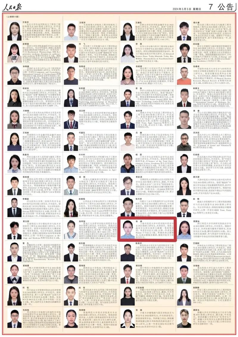 近日,《人民日报》刊登了《2022—2023学年度研究生国家奖学金获奖学生代表名录》。据悉,经过严格选拔和评审,全国4.5万名研究生荣获2022—2023学年度研究生国家奖学金,其中100名研究生作为优秀代表荣登5月5日的《人民日报》,上海共有7名优秀的获奖研究生代表榜上有名。收米直播 硕士研究生张淼名列其中,这也是我校学生首次入选该名录。