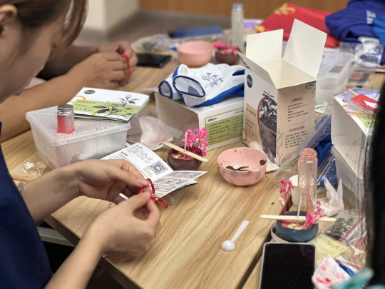 在实践团队成员的带领下,同学们很快开始了茶花香薰烛的制作。首先,使用酒精湿巾对所有需要用到的容器进行了消毒,并将大豆蜡与精油混合,盖好瓶盖,放入自热盒中,加入冷水。在等待过程中,同学们对于蜡烛烛底进行图案的DIY创作,将烛芯竖直立于底部。此时,将已经完全融化为液体的大豆蜡进行调色,并将蜡液倒入小碗中,最后在顶部加入干花进行装饰,等待完全凝固后,一个个精致的茶花香薰烛浮现眼前