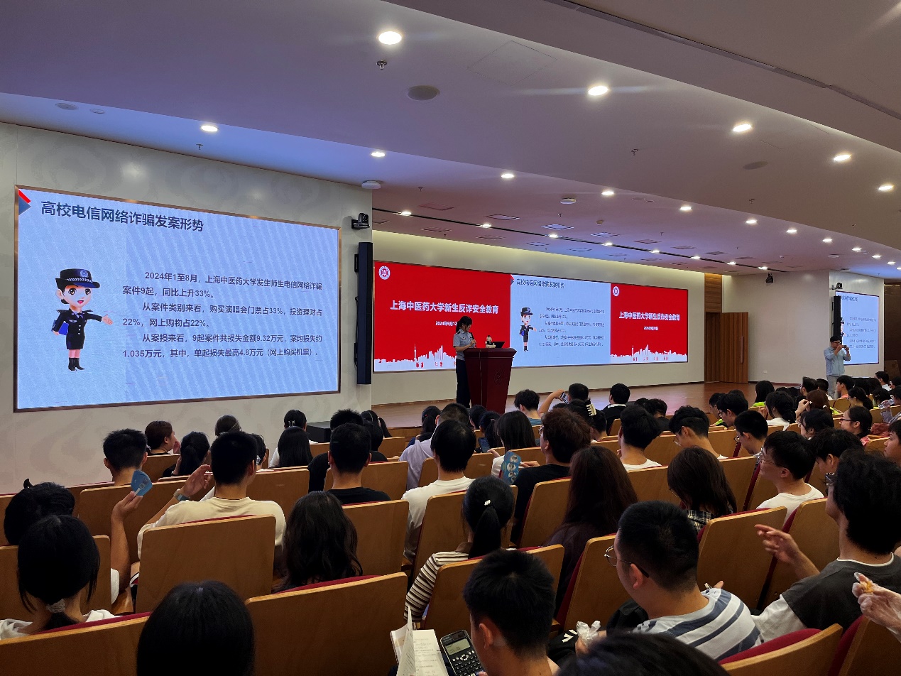 为增强新生安全防范意识,提高自我保护能力,构建安全和谐的校园环境,2024年9月12日下午,收米直播 全体新生参加了安全教育第一课—— “防范于心,反诈于行”主题讲座。本次反诈安全教育专题讲座由收米直播 、中西医结合收米直播 和公共健康收米直播 联合举办,特邀张江高校派出所殷慧警官为新生主讲。讲座由公共健康收米直播 党委副书记干旦峰主持,收米直播 党委副书记陆婧、中西医结合医院党委副书记国海东及各收米直播 新生辅导员出席。