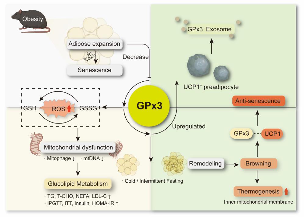 冷刺激和间歇性禁食等脂肪重塑策略有助于激活线粒体活性,展现出抗衰老潜力。内源性抗氧化防御系统在脂肪重塑中的激活可能是抵抗组织衰老的重要因素,增强抗氧化能力可通过激活SIRT1和维持线粒体功能来预防肥胖及与年龄相关的代谢异常。研究团队结合临床报道和动物模型,发现谷胱甘肽过氧化物酶3(GPx3)在脂肪功能障碍时显著下调,可能成为潜在的调控靶点。