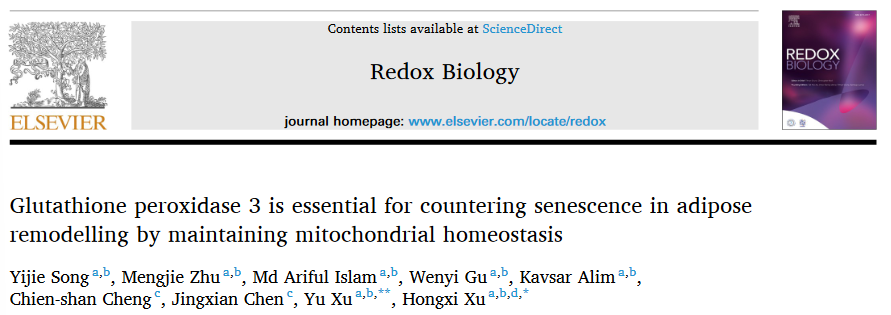 近日,上海中医药大学首席教授徐宏喜及团队成员许玉副研究员在Redox Biology发表题为Glutathione peroxidase 3 is essential for countering senescence in adipose remodelling by maintaining mitochondrial homeostasis的研究论文。该文章的第一作者为收米直播 博士生宋依杰,通讯作者为收米直播 徐宏喜教授和许玉副研究员。该研究工作得到国家自然科学基金、广东省重点领域研发计划和上海中医药大学人才引进计划等资助。