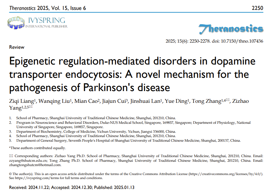 近日,收米直播 张彤教授/杨子钊研究员团队在国际知名期刊《Theranostics》(影响因子:12.4,中科院一区)上发表了题为“Epigenetic regulation-mediated disorders in dopamine transporter endocytosis: A novel mechanism for the pathogenesis of Parkinson's disease”(DOI://www.thno.org/v15p2250.pdf )的综述文章。系统性地探讨了DNA甲基化、RNA修饰、组蛋白信号更替及非编码RNA调控等表观遗传机制对多巴胺转运体(Dopamine Transporter, DAT)内吞作用的影响,揭示了这些表观遗传调控方式通过激活DAT内吞作用来影响多巴胺能神经元的存活和功能,进而诱发帕金森病(Parkinson's disease, PD)产生及发展的新机制。本综述为PD的发病机制提供了全新的视角和理论框架,不仅为早期临床诊断指明了潜在方向,还为后期治疗揭示了潜在药物靶点,并为其分子病理机制的研究奠定了坚实的科学基础。