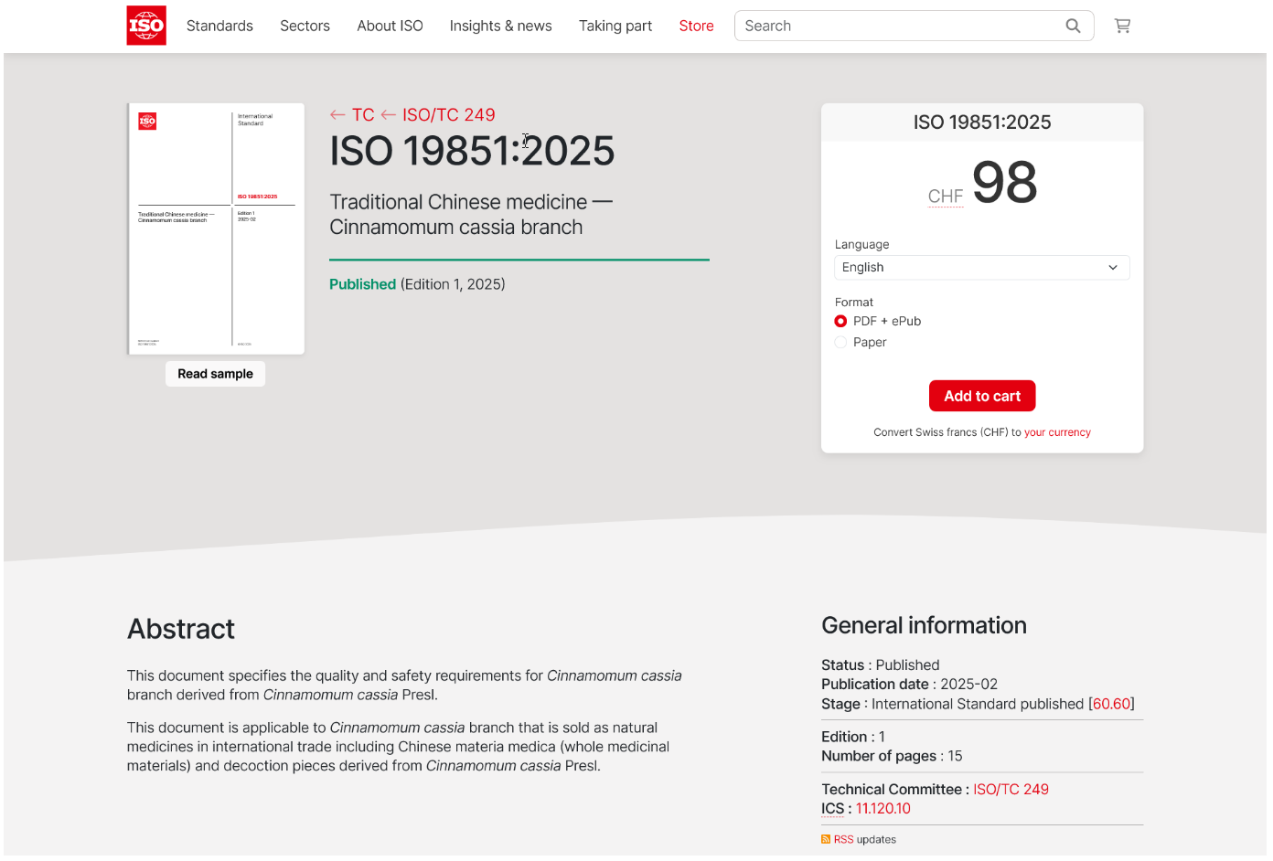 ISO19851: 2025 Traditional Chinese medicine — Cinnamomum cassia branch《中医药—桂枝》国际标准由国际标准化组织(ISO)近期正式发布,这是收米直播 张彤教授研究团队主导制定与发布的大宗中药材ISO国际标准。