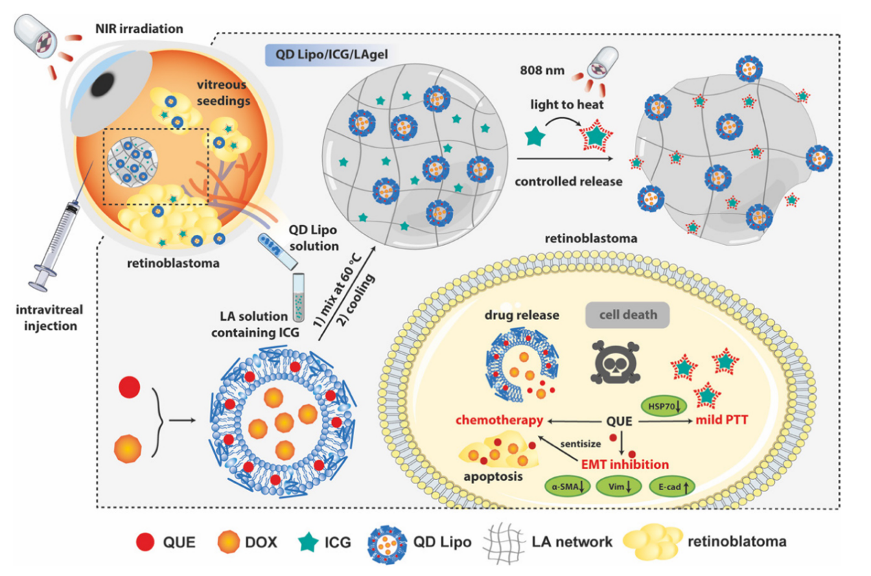 槲皮素(Quercetin,QUE)是一种广泛存在于多种中草药、蔬菜、水果中的黄酮类化合物。研究表明,QUE 不仅具有显著的抗氧化、抗炎及免疫调节作用,还能通过逆转上皮-间质转化(EMT)过程,有效抑制胶质母细胞瘤、前列腺癌和乳腺癌等多种恶性肿瘤的转移。此外,QUE 可下调热休克蛋白(HSP)的水平,从而降低肿瘤细胞的热耐受,增强热疗敏感性。然而,由于其水溶性差、生物利用度低,QUE 在眼内肿瘤治疗中的应用受到严重限制。在本研究中,研究团队利用脂质体作为药物载体,共载QUE与化疗药物多柔比星(Doxorubicin,DOX),不仅改善了药物在玻璃体中的扩散性能与眼内滞留时间,更实现了两种药物的时空同步递送与协同增效。为进一步增强药物递送的可控性和治疗效果,研究团队开发了温度响应型复合系统:将载药脂质体嵌入吲哚菁绿-低熔点琼脂糖水凝胶(ICG/LAgel),通过近红外光(NIR)触发双重效应——光热转化产生的局部升温既可诱导水凝胶相变实现药物控释,又能协同光热治疗(PTT)增强抗肿瘤效果。本研究巧妙性地整合了中药活性成分的生物调节优势与现代递药技术,提出"化疗-光热-中药协同"的多模式治疗策略,为视网膜母细胞瘤的精准治疗提供了创新解决方案。