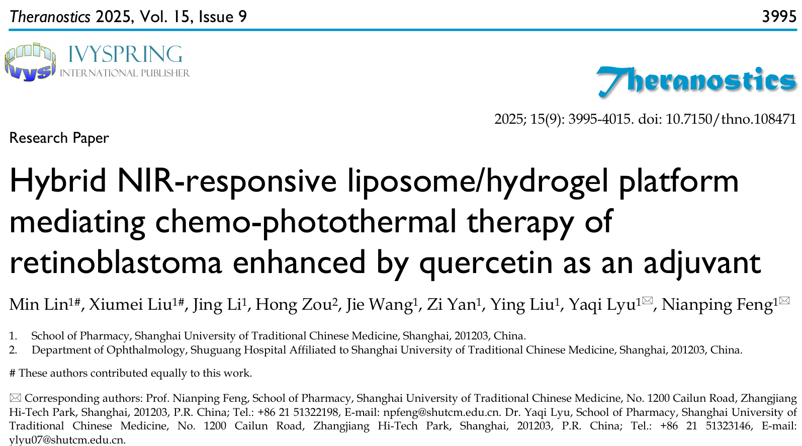 近日,收米直播 冯年平/吕雅琪团队在生物医学1区期刊《Theranostics》(IF: 12.4)发表题为Hybrid NIR-responsive liposome/hydrogel platform mediating chemo-photothermal therapy of retinoblastoma enhanced by quercetin as an adjuvant的研究论文。该研究报道了一种基于共载槲皮素/多柔比星脂质体(QD Lipo)的吲哚菁绿-低熔点琼脂糖水凝胶(QD Lipo/ICG/LAgel)。QD Lipo/ICG/LAgel是一种具有光热响应能力的可注射水凝胶药物递送系统,通过玻璃体注射将QD Lipo/ICG/LAgel植入玻璃体腔,利用近红外光的照射远程控制负载脂质体与光敏剂的释放,通过玻璃体腔内的局部可控化疗-光热治疗联合提升视网膜母细胞瘤的疗效,为视网膜母细胞瘤的治疗提供新的模式。