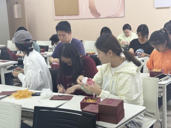 在实践团队成员的带领下,同学们首先开始了香囊的制作。由五色丝线刺绣而成、形态各异的香囊圆袋被置于桌上,在其中填入棉花以及中药香包,将香囊上的绳带一抽一拉,再系上一个寓意吉祥的平安结,一个精巧圆润的香囊便跃然手上。在香囊的馥郁芬芳中,同学们的心灵得以放松。这些由同学们亲手制作,承载着“驱邪避秽”美好寓意的香囊,最后被放置在礼盒中,将跨越群山,跟随实践团的脚步,送往彩云之南,为云南的小朋友们送上最诚挚朴素的祝愿。香囊自此成为了一道靓丽的纽带,跨越了时空,以芳香将人们连结起来,让情感不再因距离而稀释,让祝福不再因时间而褪色。