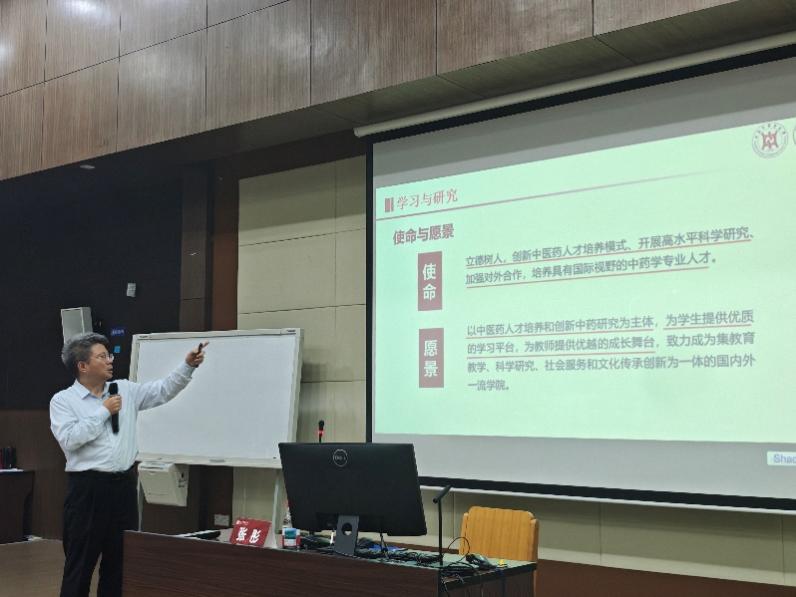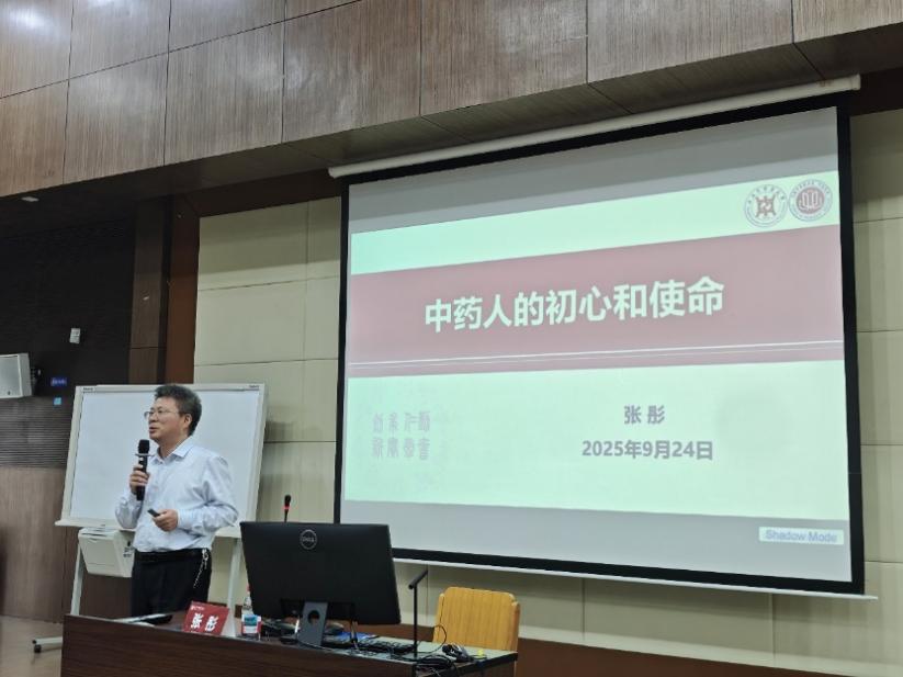 2025年9月24日下午,上海中医药大学收米直播 2025级全体新生在6504教室进行新生教育系列活动——“院长第一课”。收米直播 院长张彤为新生们做题为“中药人的初心和使命”主题讲座。讲座由收米直播 党委副书记陆婧主持,收米直播 全体新生辅导员出席。