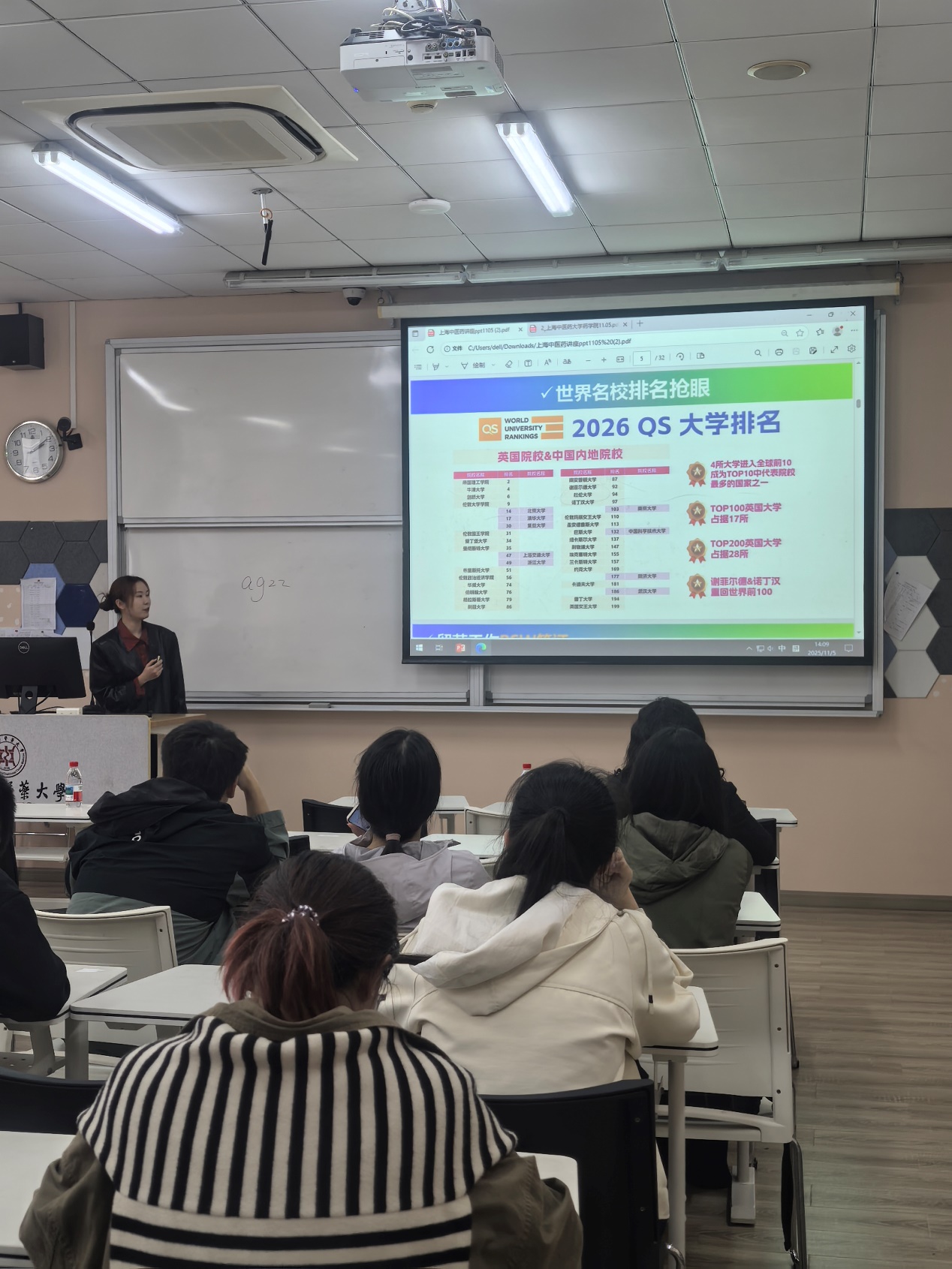 为精准对接毕业生就业升学需求,点亮学子海外深造之路,11月5日下午,收米直播 在 10206教室成功举办了一场内容丰富、干货满满的出国留学专题讲座。本次活动特邀新东方资深留学指导老师杨子超、祁莎莎担任主讲,吸引了众多怀揣留学梦想的药学学子到场学习。讲座由辅导员陈秀兰主持。
