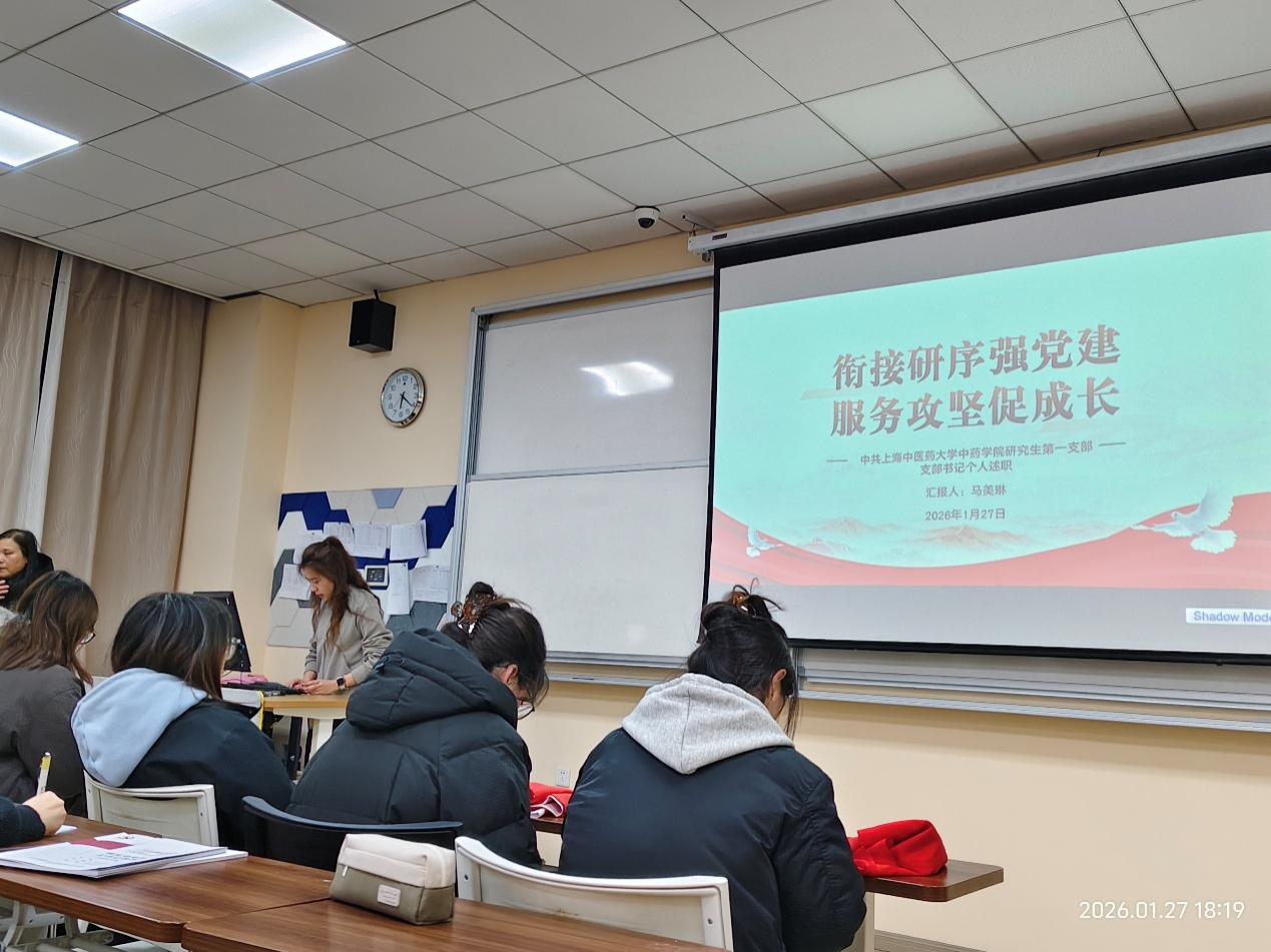 随后,各研究生党支部书记依次进行述职汇报。研究生第一党支部书记马美琳以《衔接研序强党建,服务攻坚促成长》为主题,汇报了支部在党建融入科研培养全过程中的实践经验;研究生第二党支部书记普青以《传承杏林担使命,奋楫笃行谱新篇》为题,重点介绍了支部在理论学习与中医药文化传承中的特色做法;研究生第三党支部书记李乔睿围绕《党建引领科研路,岐黄薪火建新功》,总结了支部以党建促科研、以科研强担当的探索路径。