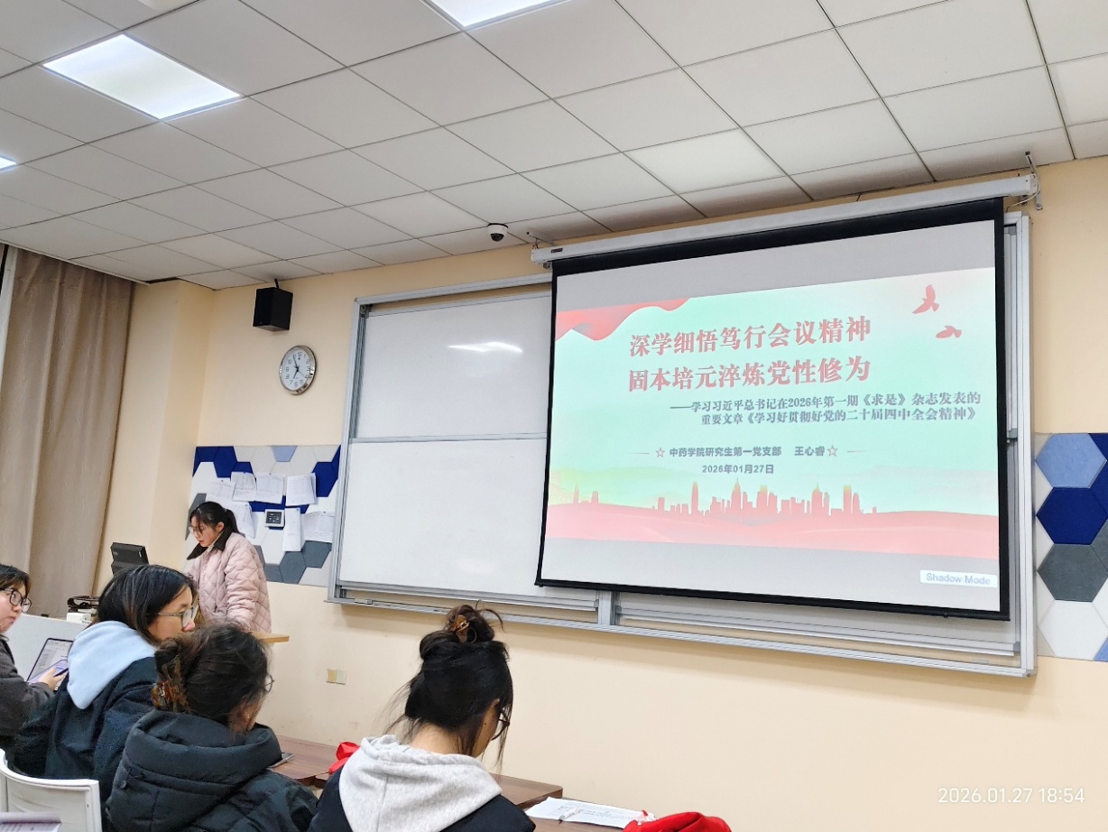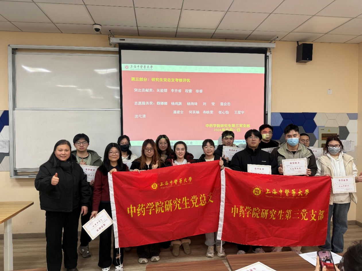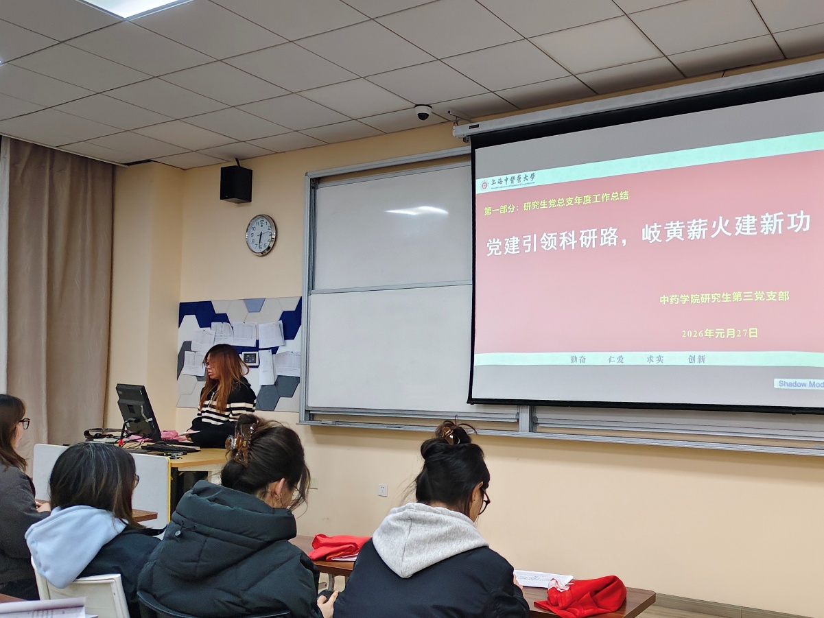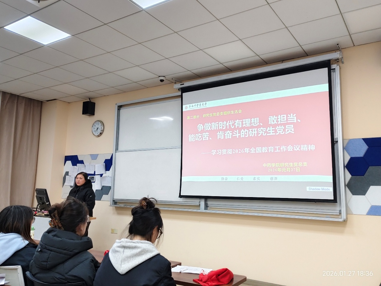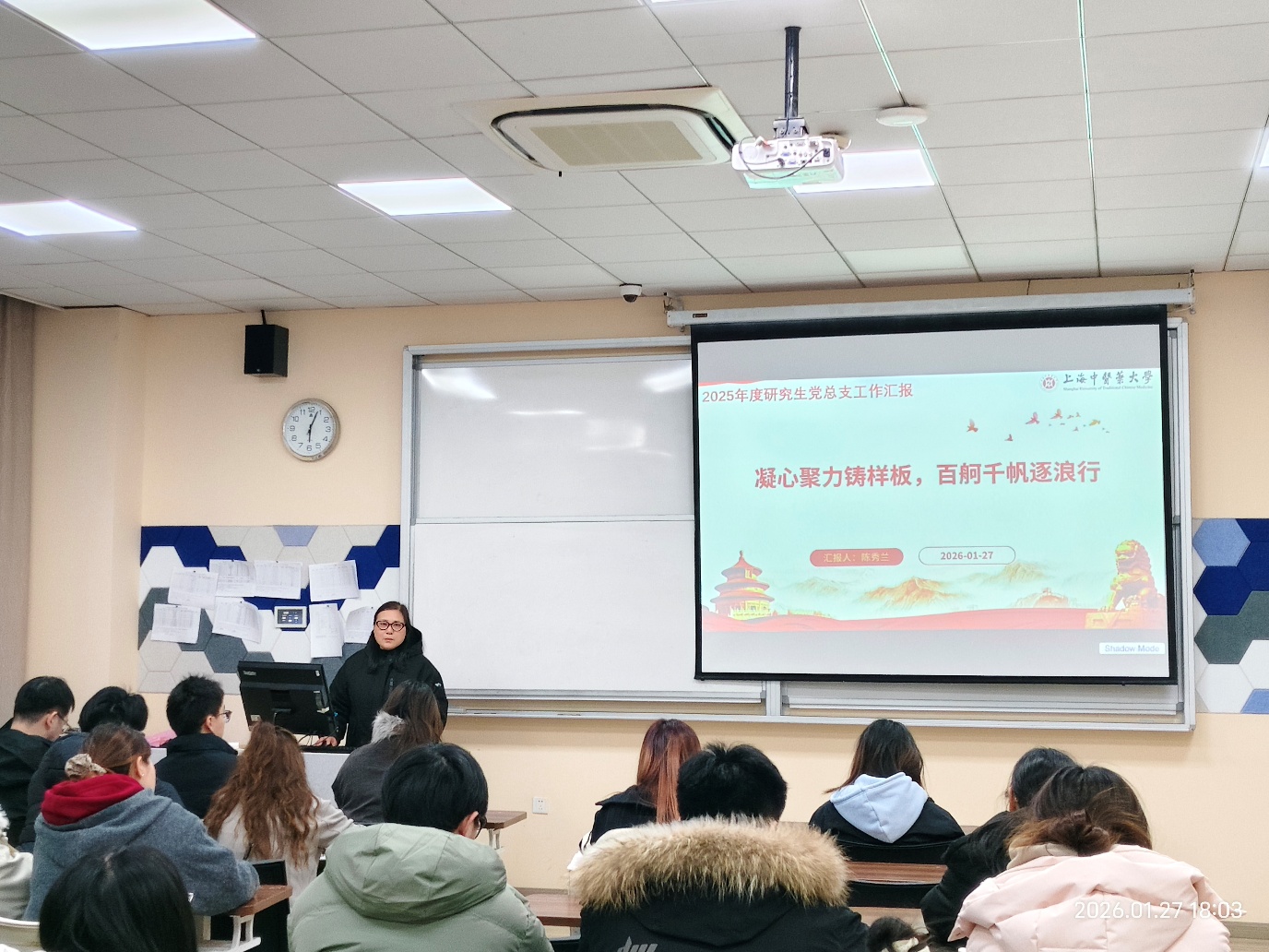 2026年1月27日晚18点,上海中医药大学收米直播 研究生党总支在7304教室召开以“争做新时代有理想、敢担当、能吃苦、肯奋斗的研究生党员”为主题的2025年度党员总结会。本次会议由收米直播 研究生党总支书记陈秀兰同志主持,党总支全体党员参会。